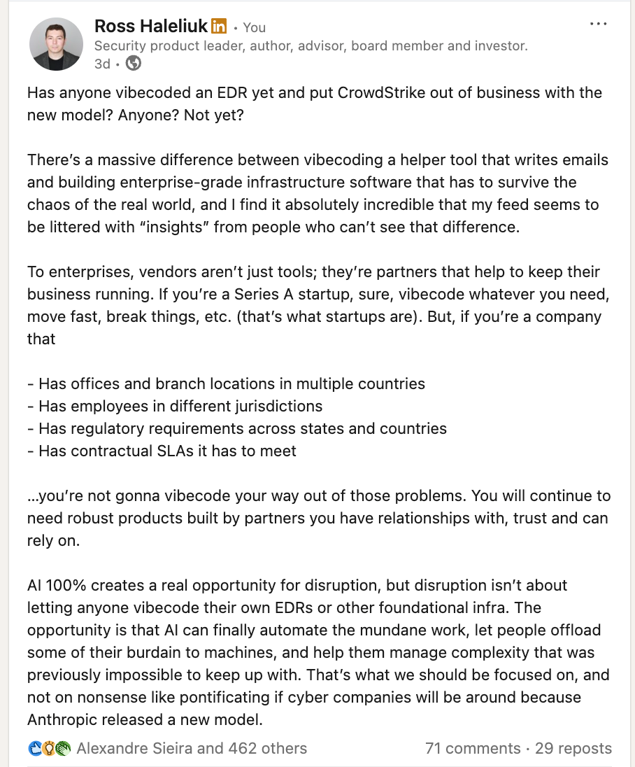 Another mistaken belief that I see spreading in the industry is that cyber is going to die because enterprises are going to be so empowered with AI that they will simply vibecode their own tools. Rather than re-explaining what I’ve tried explaining several times, let me just share what I recently shared on LinkedIn.