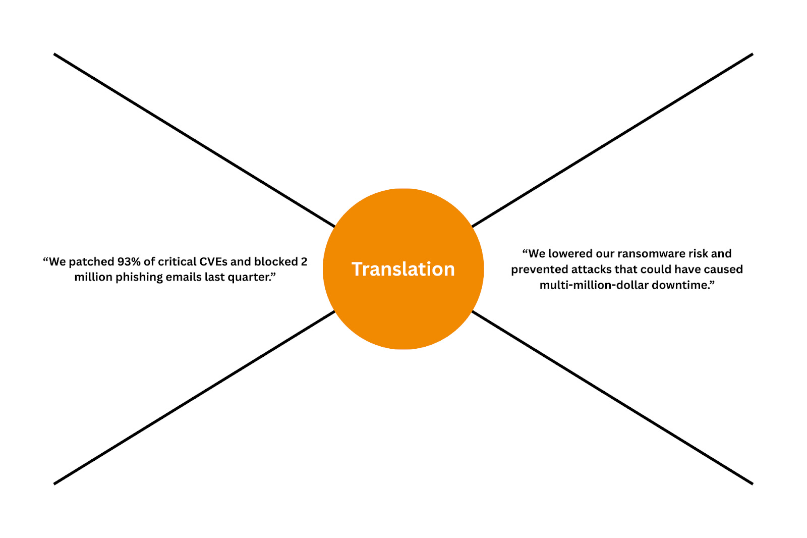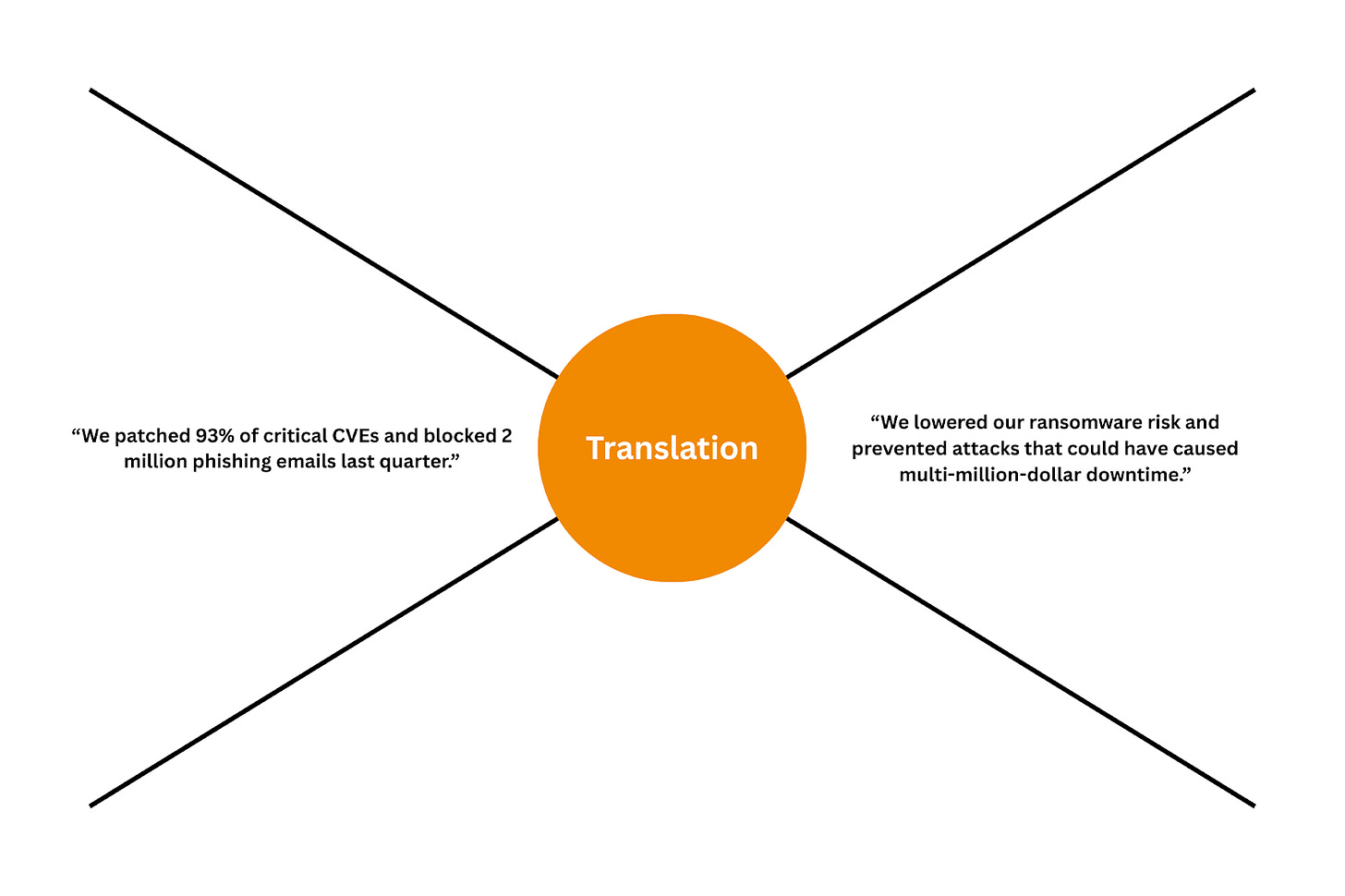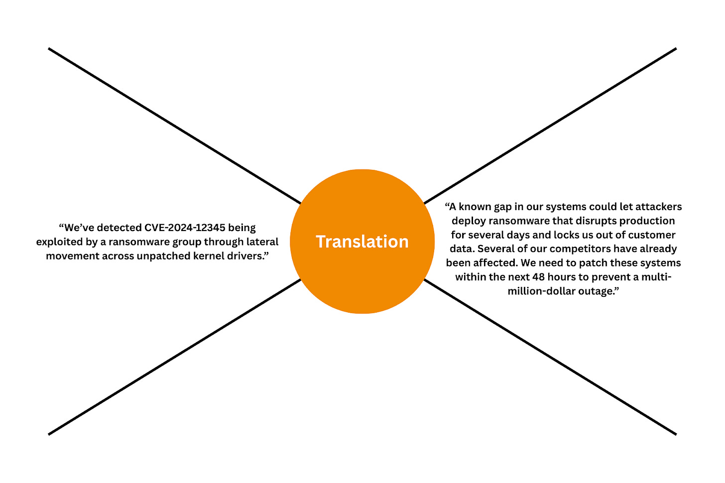 Business leaders care about how security risks can impact their revenue, customers, reputation, or operations. They care about outages, customer churn, regulatory fines, and competitive disadvantage, and not about which ransomware family is exploiting which kernel vulnerability. The disconnect here isn’t because those outside of security don’t care about details, but because many don’t see these details as relevant.
