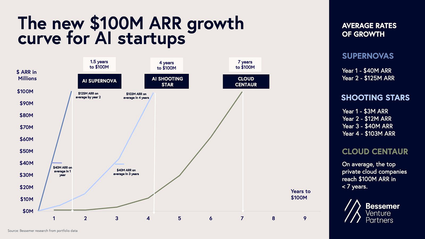 Several months ago, Bessemer published The State of AI 2025 report (if you haven’t seen it, I highly recommend giving it a read). In this report, they discuss the trends in the AI world and put forward some predictions about the coming years. It’s a good read overall, but what stood out to me is the idea that before AI, top companies would on average need ~7 years to reach $100M ARR. In the post-AI world, the amount of time has been shortened dramatically. Today, according to Bessemer, great AI startups (they call them “AI Shooting Stars”) get to $100M in 4 years, and exceptional AI companies, which Bessemer calls “AI Supernovas,” get to $100M ARR in some 1.5 years.