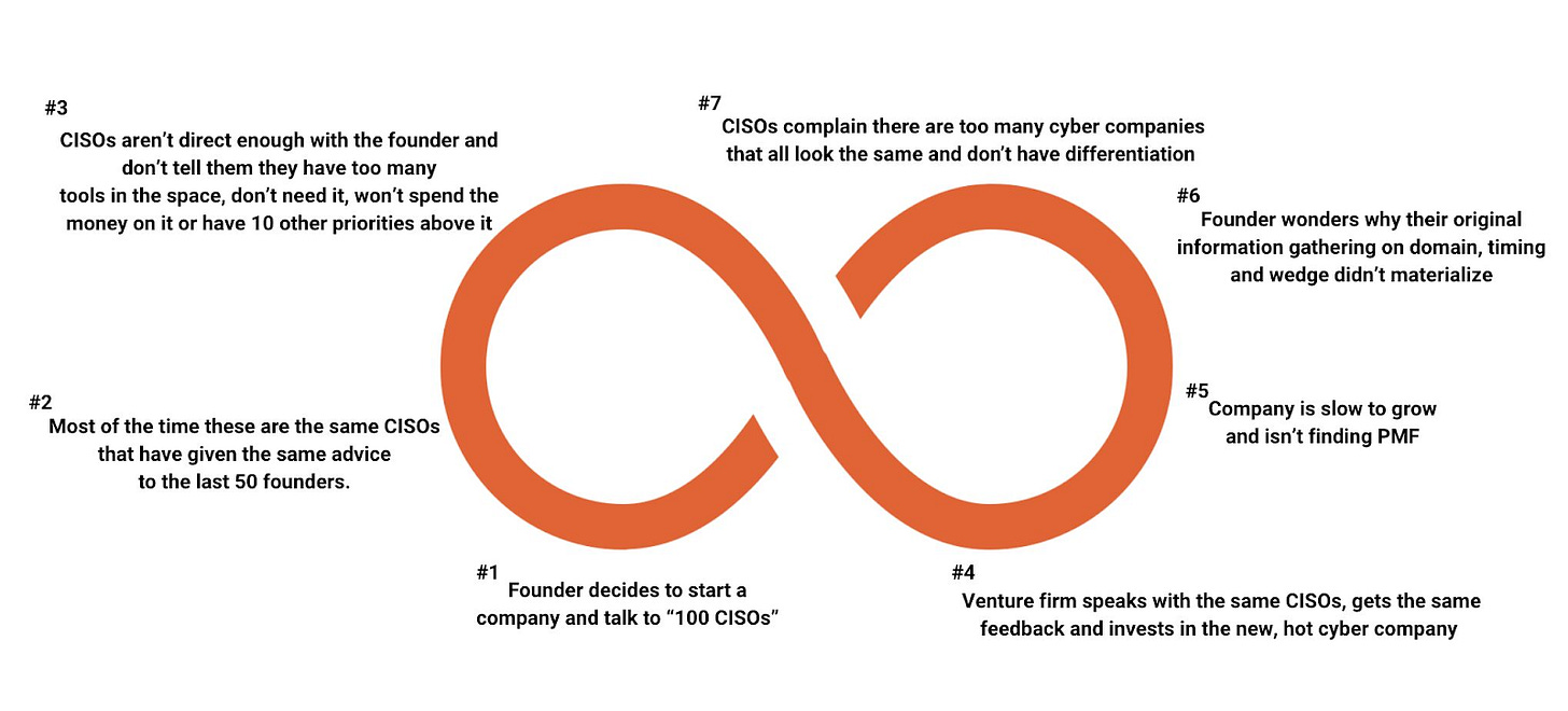 Stephen’s diagram hits the nail on the head. In cyber, most startup journeys begin in a similar way: a founder decides to “talk to 100 CISOs” before building. In practice, most of those conversations are with the same group of CISOs - industry veterans who have already given nearly identical feedback to dozens of other founders. Nobody can blame CISOs for doing it because, at the end of the day, they are being asked the same questions over and over, so most of the time (unless founders get them on a bad day), they’ll give the same answers.